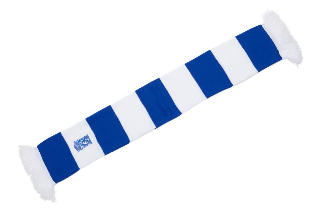 Dziecięcy zalik Lecha Poznań w niebiesko-białe pasy i haftowanym herbem drużyny.