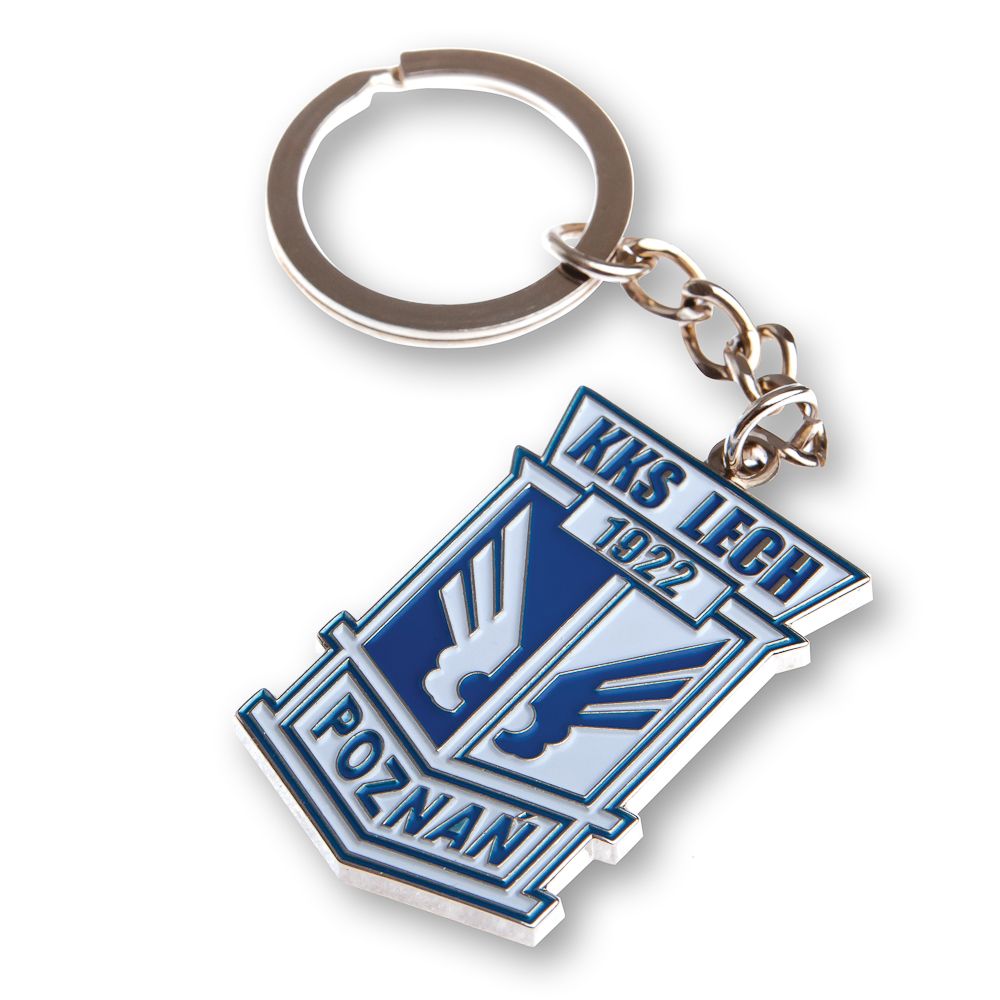 Oryginalny metalowy breloczek Lecha Poznań w niebiesko-białych barwach w kształcie herbu poznańskiej drużyny. Niepowtarzalny jako przywieszka do kluczy, plecaka czy upominek dla bliskiej osoby.
