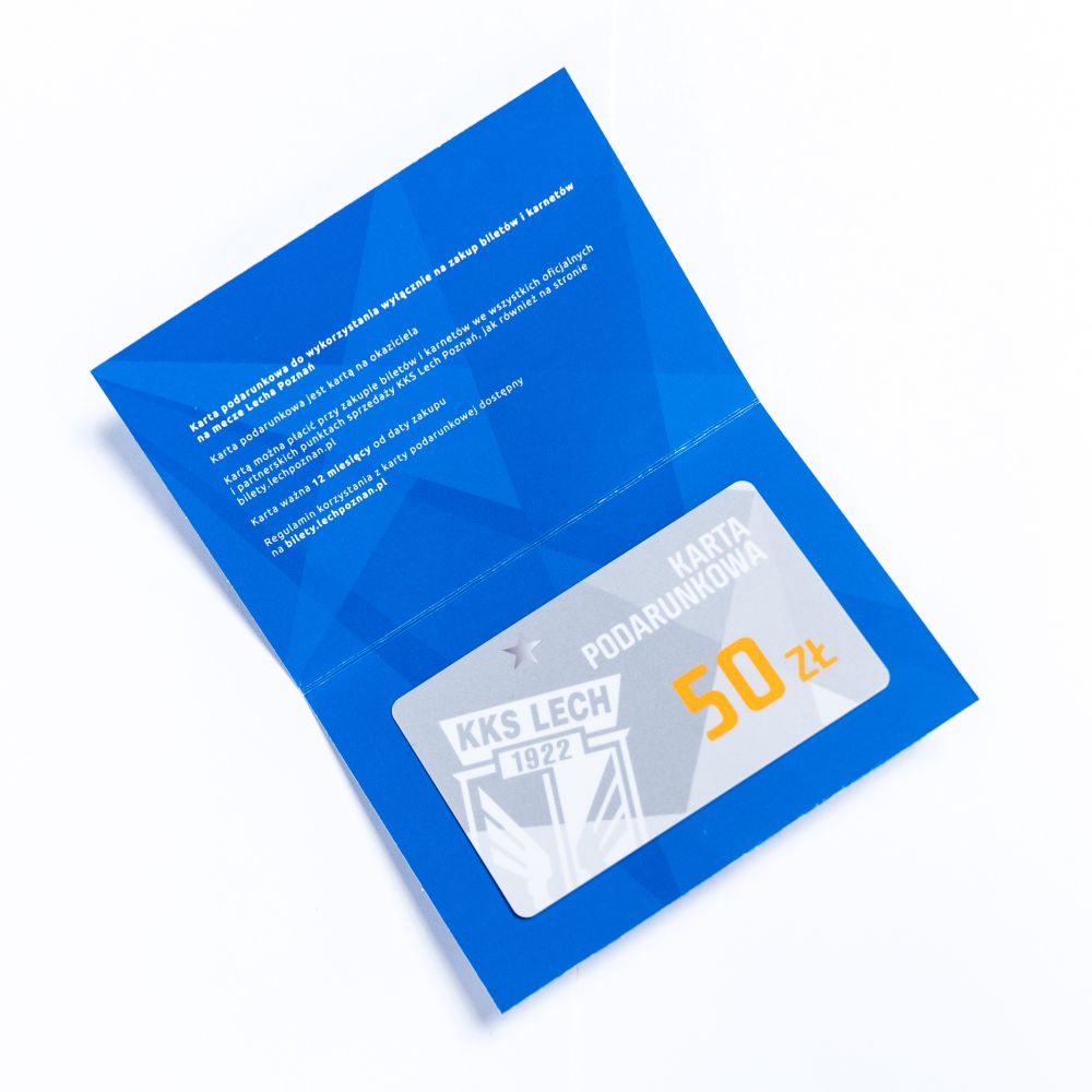 Karta podarunkowa do wykorzystania wyłącznie na zakup biletów i karnetów na mecze Lecha Poznań oraz na zwiedzanie stadionu i muzeum. Karta podarunkowa jest kartą na okaziciela Kartą można płacić przy zakupie biletów i karnetów we wszystkich oficjalnych i partnerskich punktach sprzedaży KKS Lech Poznań, jak również na stronie bilety.lechpoznan.pl Karta ważna 12 miesięcy od daty zakupu.