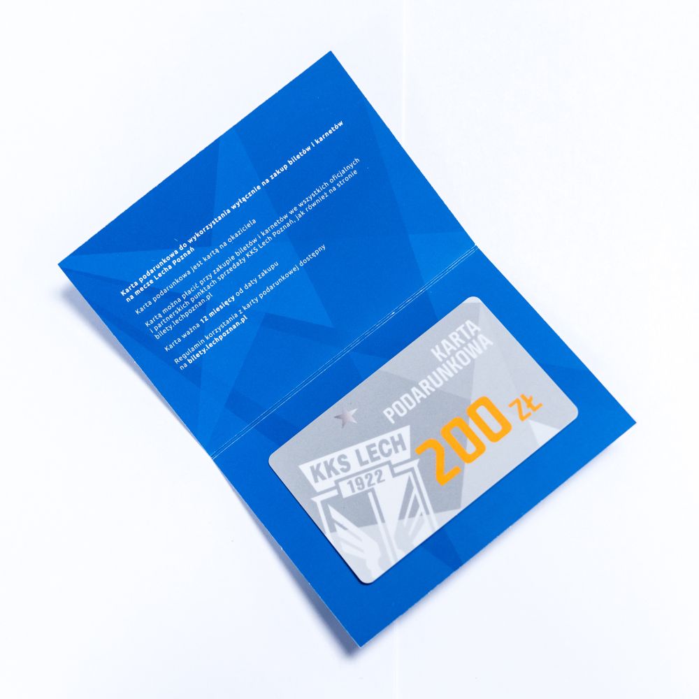 Karta podarunkowa do wykorzystania wyłącznie na zakup biletów i karnetów na mecze Lecha Poznań oraz na zwiedzanie stadionu i muzeum. Karta podarunkowa jest kartą na okaziciela Kartą można płacić przy zakupie biletów i karnetów we wszystkich oficjalnych i partnerskich punktach sprzedaży KKS Lech Poznań, jak również na stronie bilety.lechpoznan.pl Karta ważna 12 miesięcy od daty zakupu.