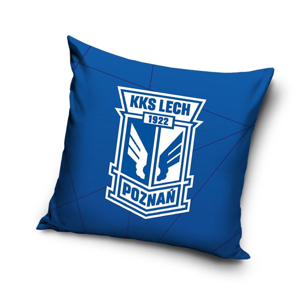 Duża, miękka poduszka z herbem Lecha Poznań na tle ciekawej grafiki.