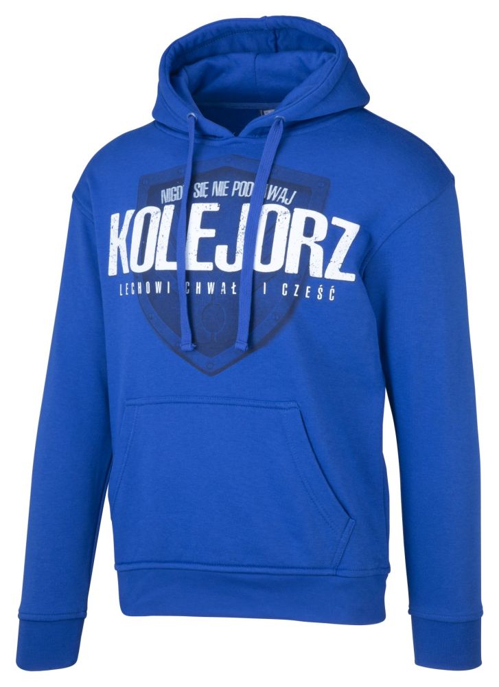 Niebieska kangurka z nadrukiem Kolejorz na piersiach. Na plecach duża grafika.