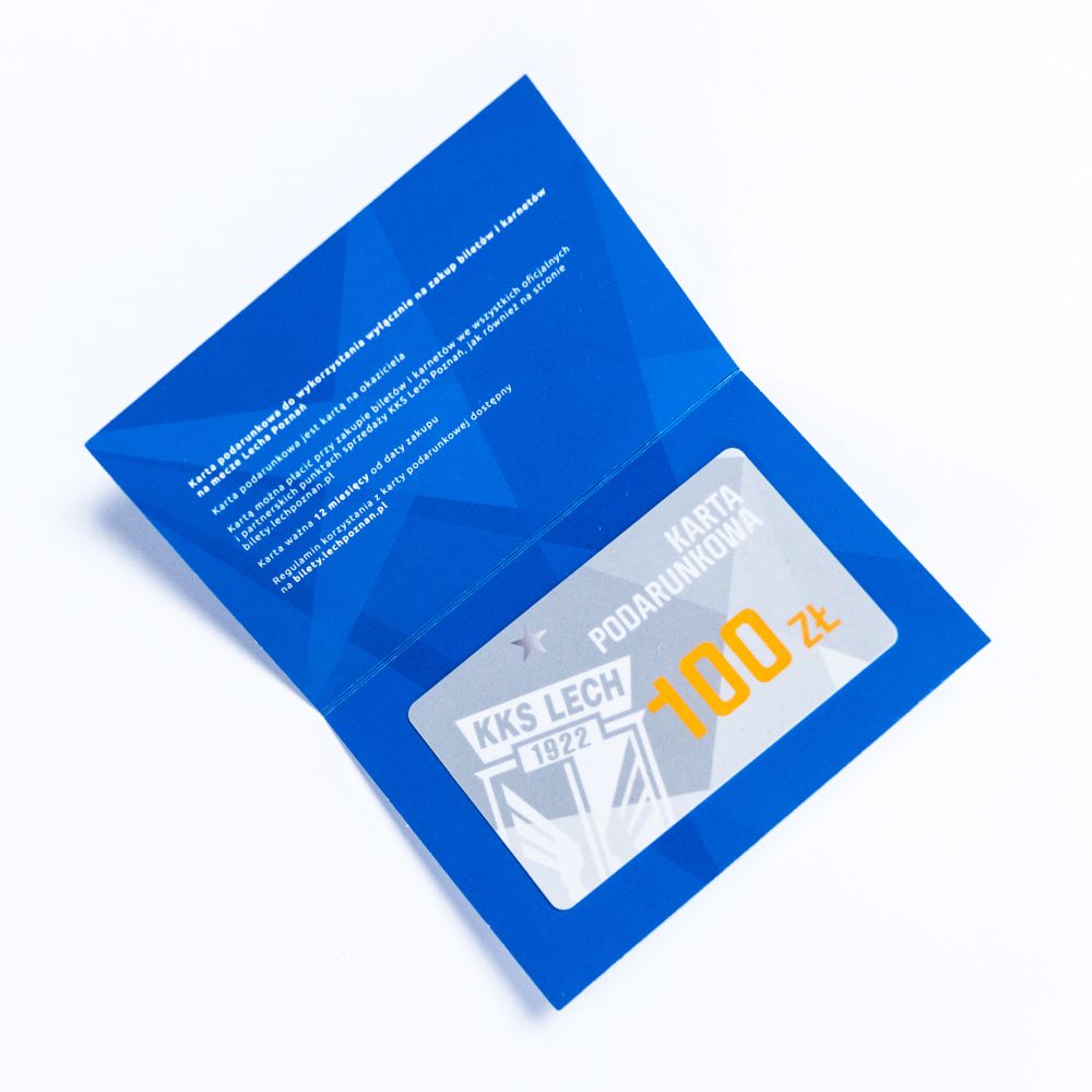 Karta podarunkowa do wykorzystania wyłącznie na zakup biletów i karnetów na mecze Lecha Poznań oraz na zwiedzanie stadionu i muzeum. Karta podarunkowa jest kartą na okaziciela Kartą można płacić przy zakupie biletów i karnetów we wszystkich oficjalnych i partnerskich punktach sprzedaży KKS Lech Poznań, jak również na stronie bilety.lechpoznan.pl Karta ważna 12 miesięcy od daty zakupu.