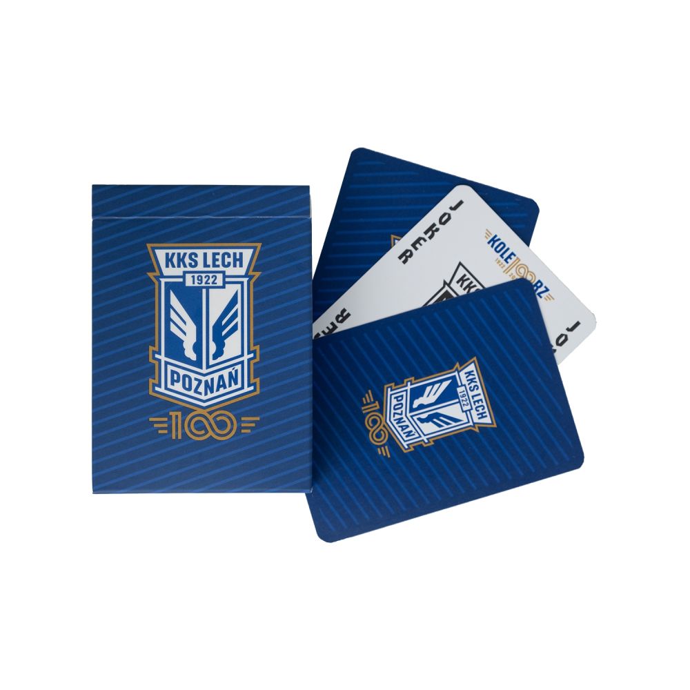 Okolicznościowa talia kart do gry z motywem na 100-lecie powstania Lecha Poznań. Wykonana z trwałego materiału i zapakowana w tekturowe pudełeczko.