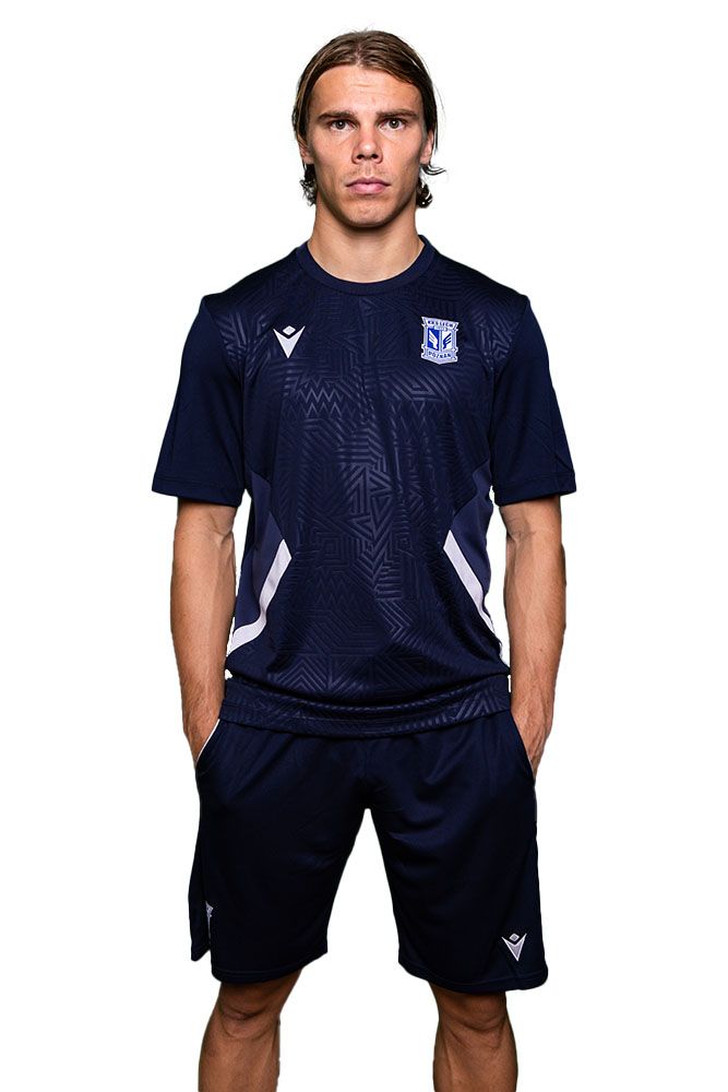 Granatowy kolor z subtelnymi detalami, herbem Lecha Poznań i logo Macron nadaje koszulce nowoczesny i sportowy wygląd.