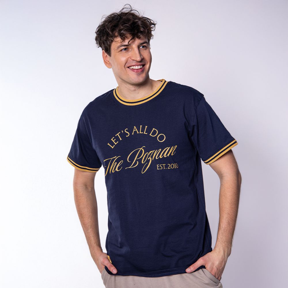 Granatowa wersja koszulki to klasyczna, elegancka forma połączona z wyrazistymi, złotymi detalami, które podkreślają wyjątkowy charakter projektu.