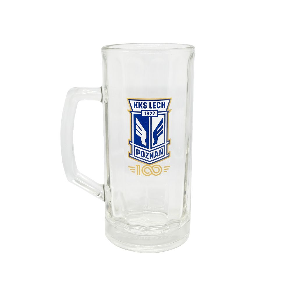 Efektowny, duży kufel zdobiony grafiką herbu rocznicowego na 100-lecie Lecha Poznań. Wykonany z solidnego, grubego szkła. Wysoka jakość wykonania.