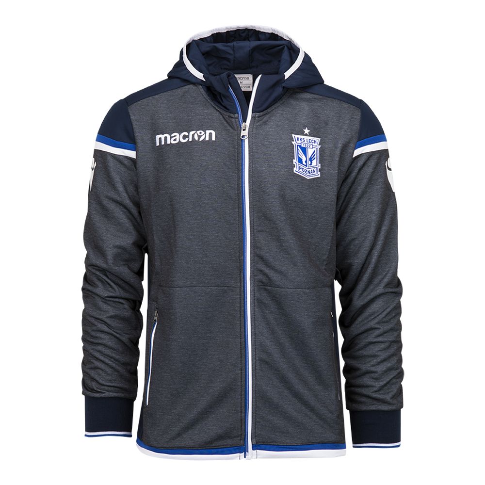 Rozpinana bluza w kolorze szarego melanżu. Z przodu herb Lecha i logo Macrona. Tył bluzy zdobi nadruk Lech Poznań. Wysoka jakość wykończenia, grube ściągacze i kaptur w kontrastującym granacie, dodatkowo niebiesko-białe wstawki.