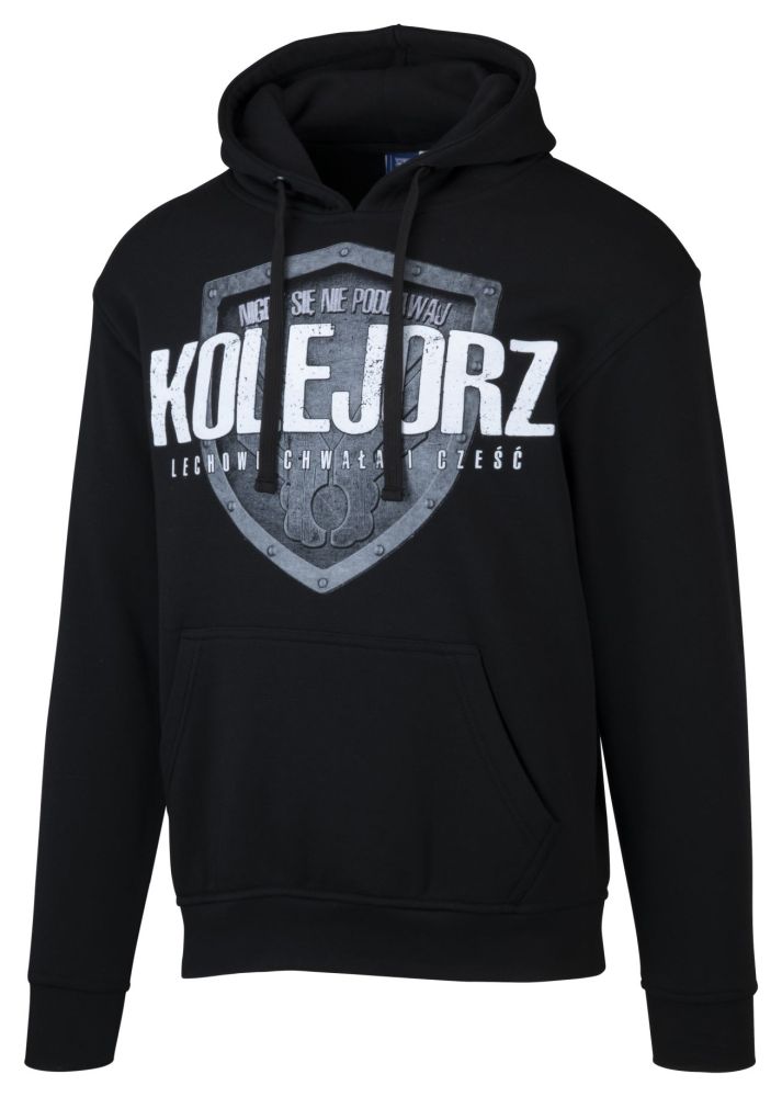 Czarna kangurka z nadrukiem Kolejorz na piersiach. Na plecach duża grafika.