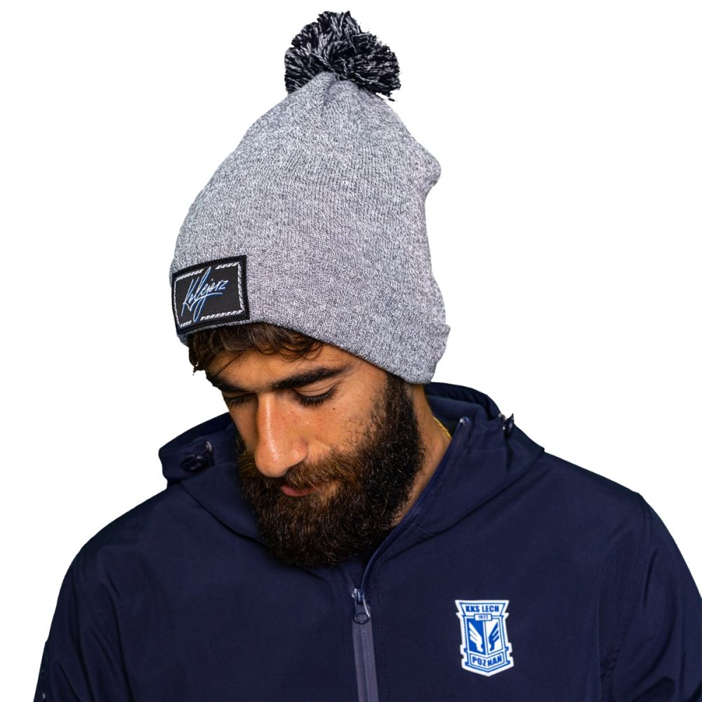 Czapka z pomponem w melanżowym szarym odcieniu, wykonana z elastycznego materiału który dopasowuje się do kształtu głowy. Produkt zdobi naszywka z ozdobnym haftem Kolejorz.