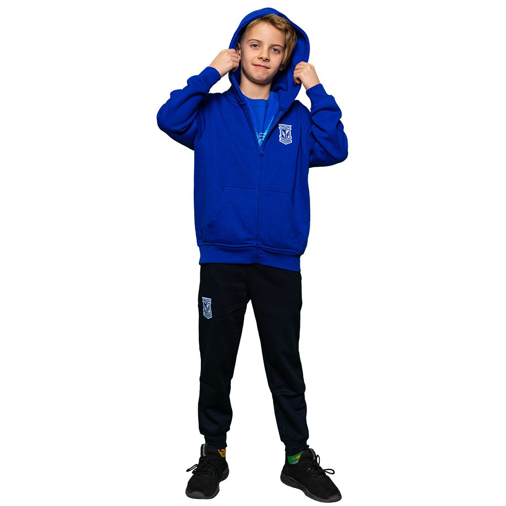 Dziecięcy dres składający się z niebieskiej bluzy i granatowych spodni.