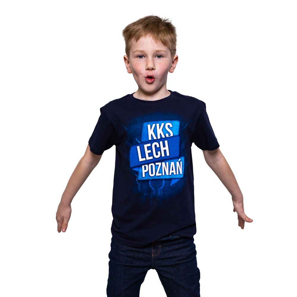 Koszulka dziecięca granatowa z motywem skrzydełek z herbu Lecha Poznań na tle napisu "KKS LECH POZNAŃ".