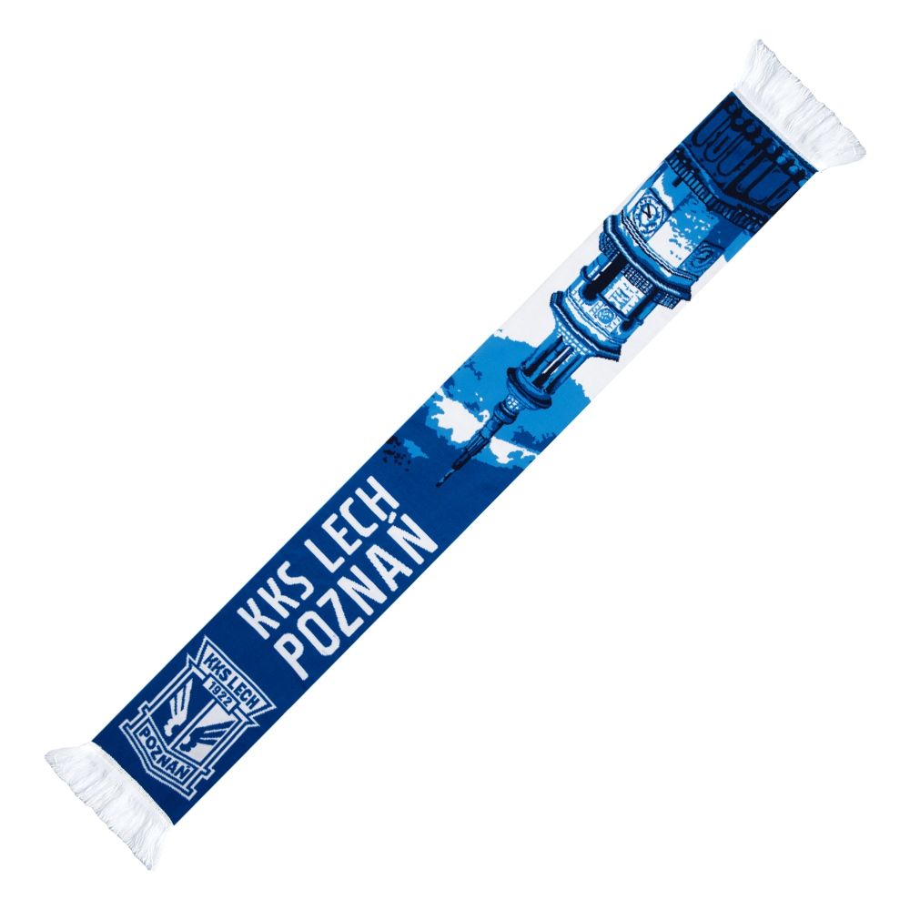 Miękki, przyjemny w dotyku, dwustronny szalik z wizerunkiem wieży ratuszowej w Poznaniu.