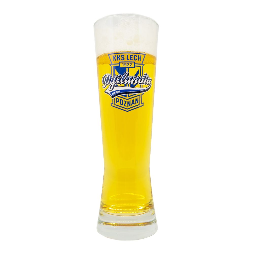 Duża szklanka do piwa o pojemności 500 ml z nadrukowaną grafiką monochromatycznego herbu Lecha Poznań z wplecionym napisem Pyrlandia.