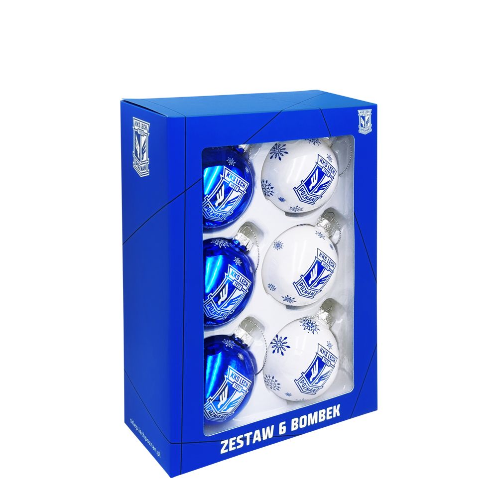 Zestaw 6 bombek choinkowych Lech Poznań w niebiesko-białej kolorystyce z oficjalnym herbem klubu. Połączenie błyszczących i matowych powierzchni oraz delikatnych motywów śnieżnych sprawia, że bombki świetnie prezentują się na choince. Całość zapakowana w estetyczne, klubowe pudełko – idealne na prezent dla kibica Lecha Poznań.