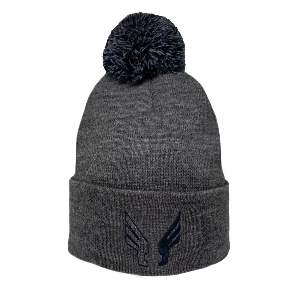 Szara czapka zimowa z dwukolorowym pomponem oraz wyhaftowanymi skrzydełkami.