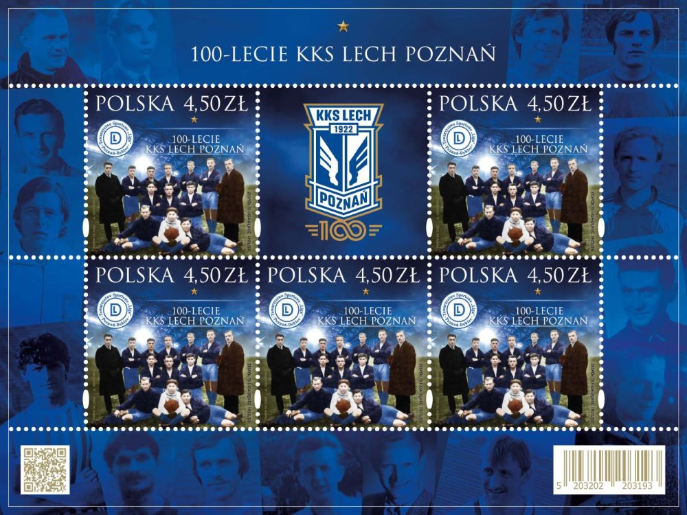 Wyjątkowy, okolicznościowy znaczek wprowadzony do obiegu przez Pocztę Polską 19 marca 2022 roku, z okazji stulecia powstania Lecha Poznań. Arkusz składa się z pięciu znaczków oraz ozdobnej przywieszki.